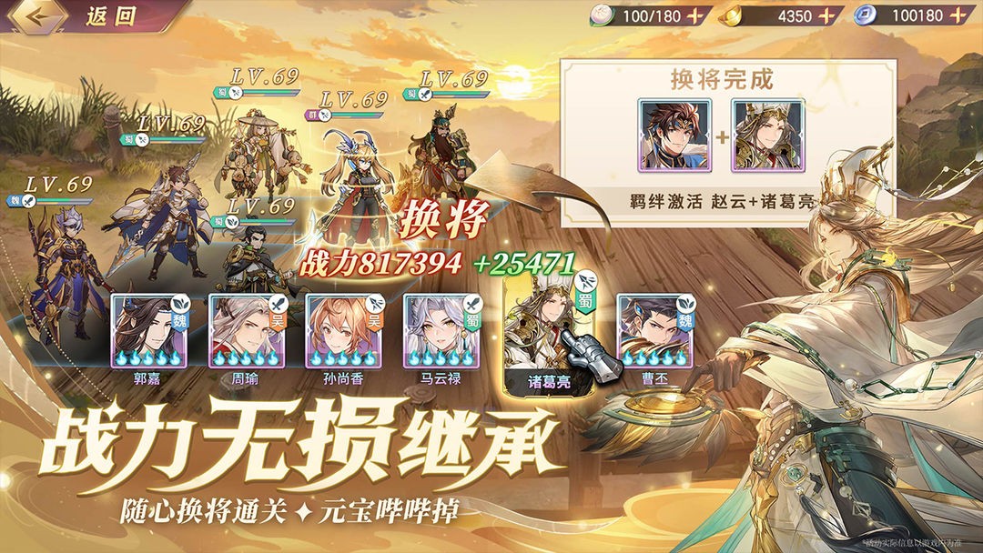 1、 零损换将灵活变阵克敌阵容变换,武将等级、装备一键百分百继承,省去重复培养烦恼