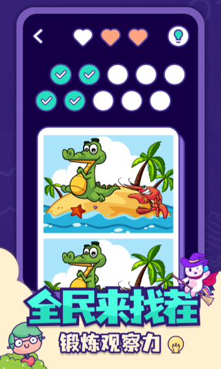 全民找茬2是一款极具趣味性的休闲益智游戏,深受玩家喜爱。它以独特的游戏模式和丰富的内容为玩家带来了非凡的游戏体验。在这个游戏中,玩家需要通过细致的观察,找出两张看似相同的图片之间的不同之处。这种简单而富有挑战性的玩法,不仅锻炼了玩家的观察力和专注力,还考验了耐心与毅力,游戏中的每一关都精心设计,图片内容丰富多彩,涵盖了自然风光、城市风景、动物世界以及人文景观等多个主题。